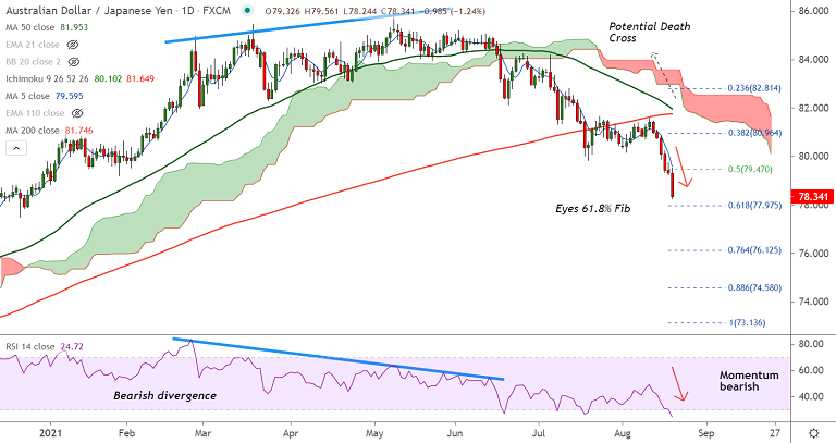 AUD/JPY slumps over 1.25% on the day and was trading at 78.33 at around 09:25 GMT, outlook bearish.