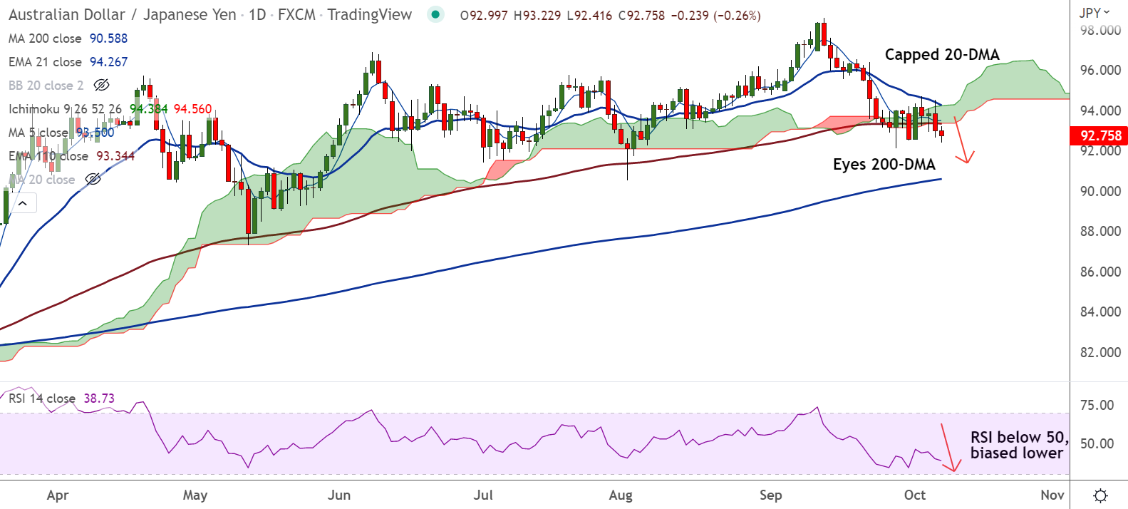 Summary: AUD/JPY trades with a bearish bias. The pair eyes 200-DMA support at 90.66. Break below will open downside.