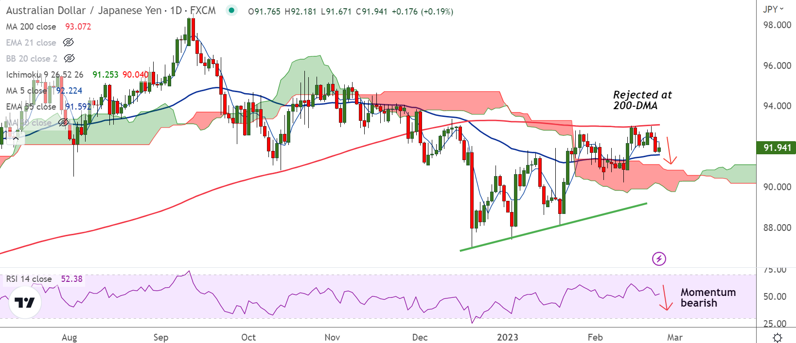 Summary: AUD/JPY finds series of strong supports till 91.60 level. Decisive break above cloud keeps scope for more gains. Bullish invalidation below 55-EMA. On the flip side, break out above 200-DMA will propel the pair higher.