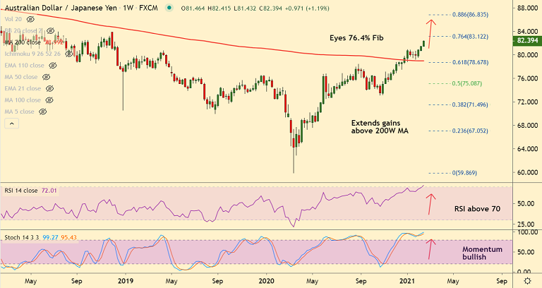5-DMA is immediate support at 81.53. Break below could see weakness till 21-EMA at 80.69. retrace below 200W MA will negate further upside.