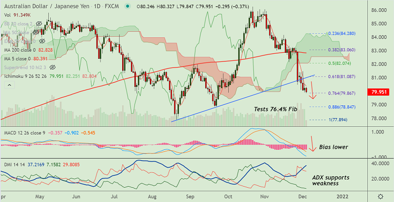 The pair has tested 76.4% Fib retracement at 79.86, scope for further weakness. MACD and ADX support downside.