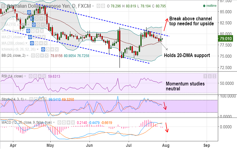 - AUD/JPY slides along stiff channel top resistance, downside pauses at 20-DMA support currently at 78.39.
