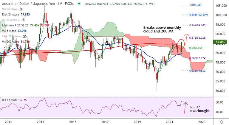 AUD/JPY was trading 6.77% higher on the month and has shown a break above 200 monthly moving average, raising scope for further gains.
