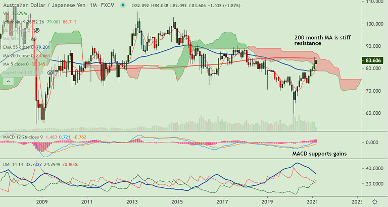 Major trend in the pair is bullish. Price action is on track to test 200 month MA at 84.66. Watch out for decisive break above for upside continuation.