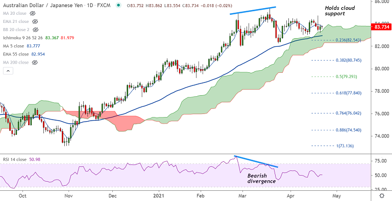 AUD/JPY was trading rangebound on the day with session high at 83.86 and low at 83.55.