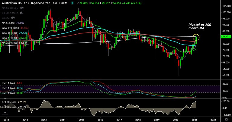 Breakout above 200 month MA could take the pair to 90 levels. Failure to break above will see some consolidation at current levels. Retrace below 200W MA will see major weakness.