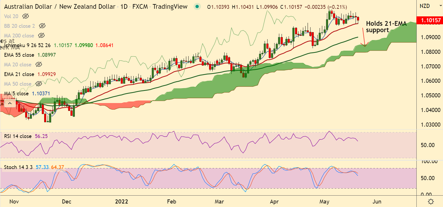 Support levels - 1.0993 (21-EMA), 1.0899 (55-EMA)