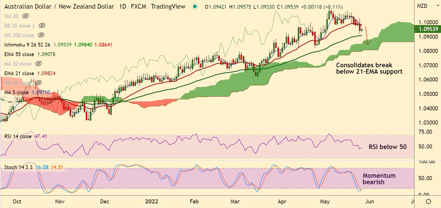 Summary: AUD/NZD trades with a bearish bias. Upticks are likely to be limited. Scope for test of 55-EMA at 1.0907.