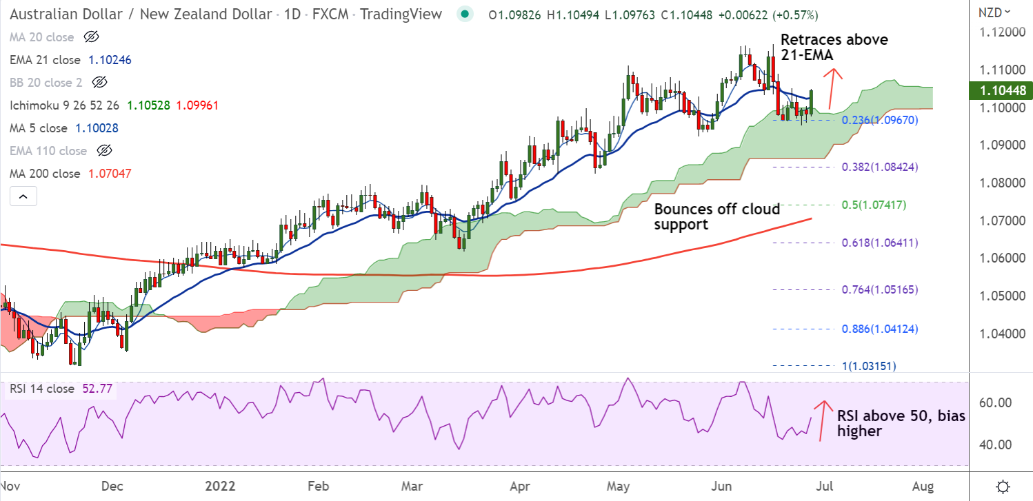 Summary: AUD/NZD has paused downside at daily cloud support. Retrace above 21-EMA raises scope for upside resumption.