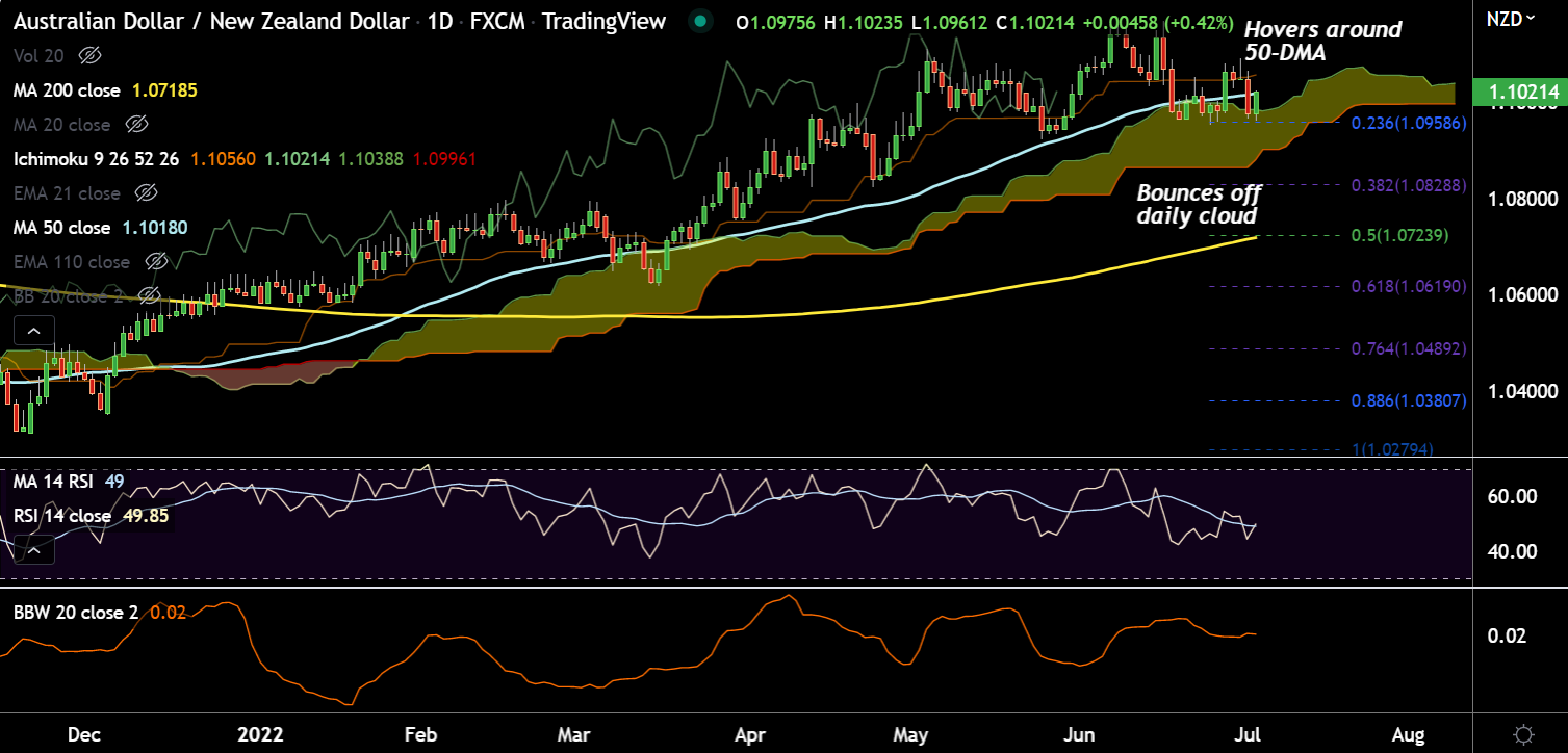 - The pair has bounced off daily cloud support, hovers around 50-DMA