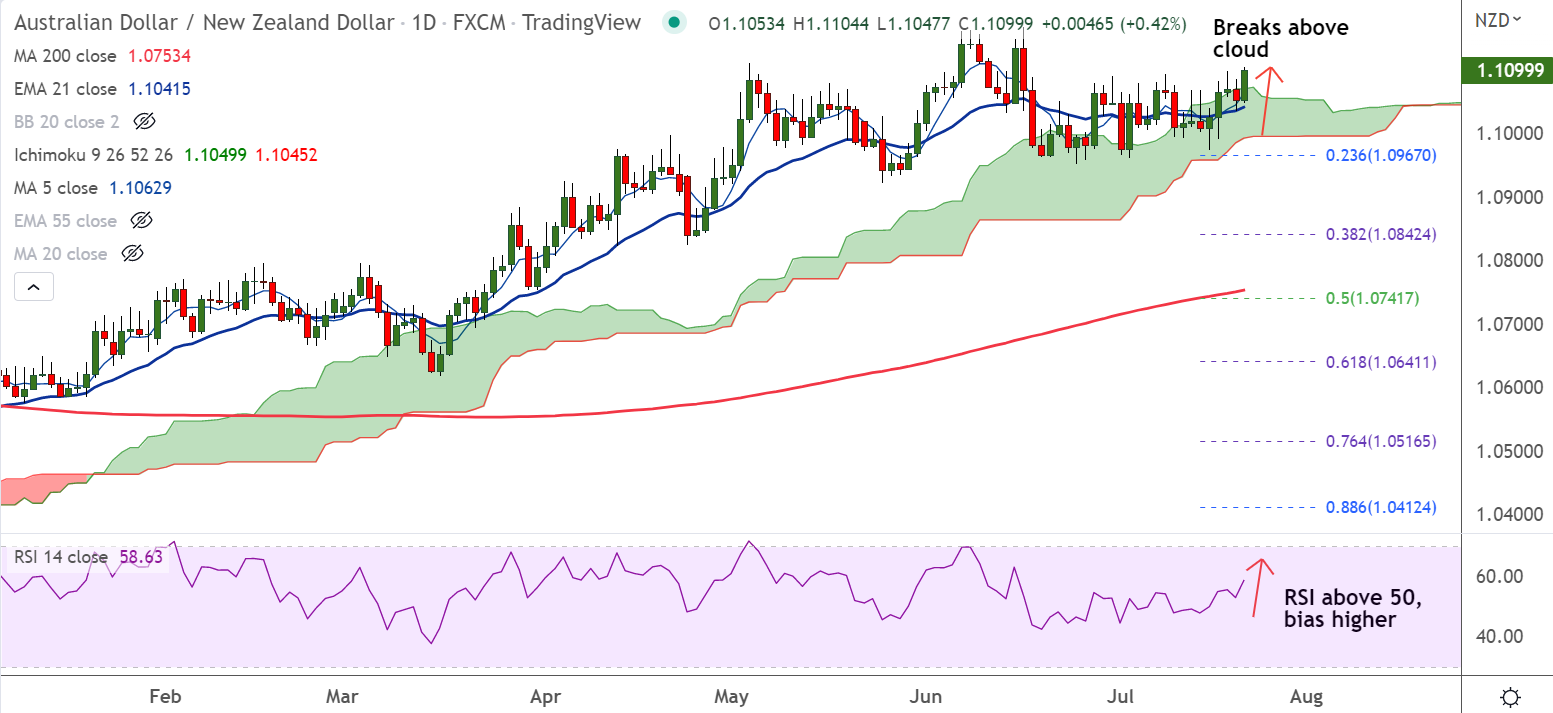 Summary: AUD/NZD poised for further upside. Decisive break above cloud has opened upside in the pair. Scope for retest of yearly high at 1.1168.