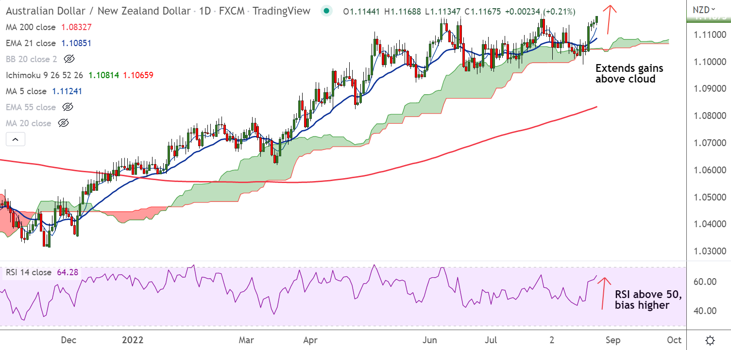 - The pair is extending upside for the 5th straight session, outlook is bullish