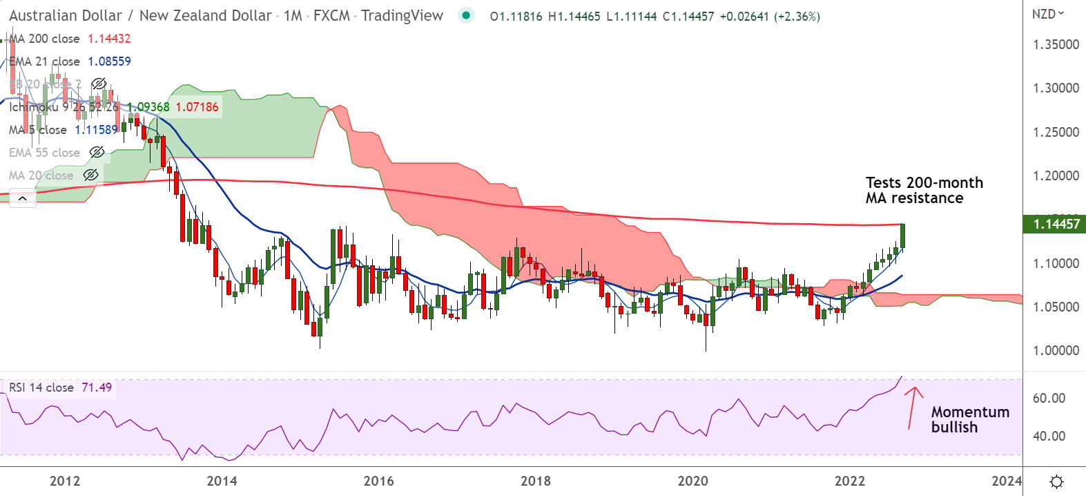 The pair is testing major resistance at 200-month MA at 1.1443, decisive break above required for upside continuation.