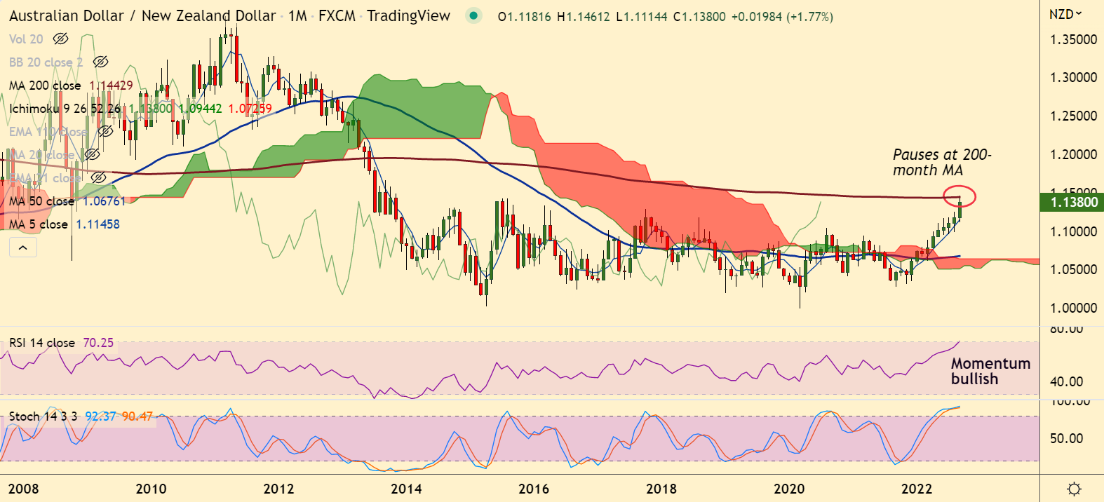 Summary: AUD/NZD finds major resistance at 200-month MA. Technical indicators are biased higher. Watch out for decisive break above 200-month MA for upside continuation.