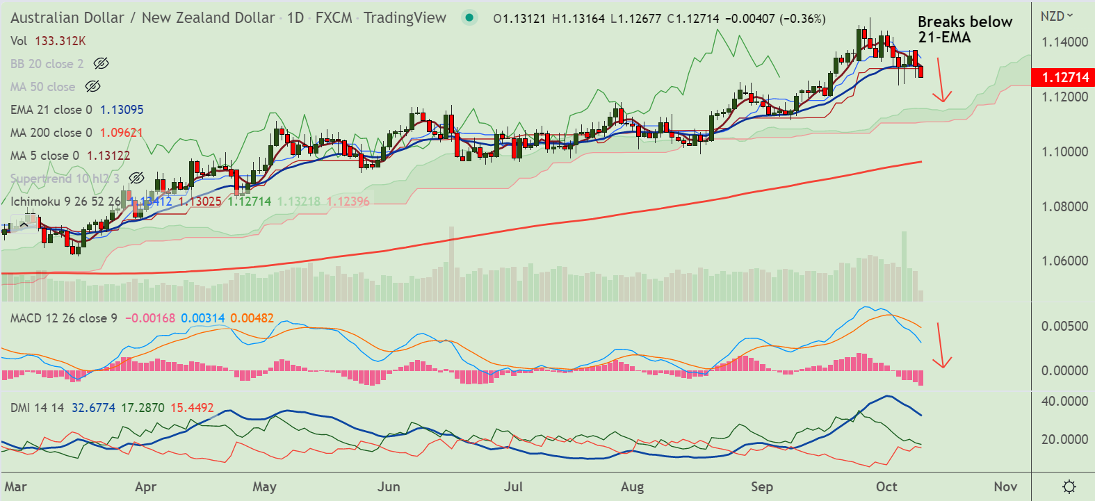 Summary: AUD/NZD trades with a bearish bias. Close below 21-EMA support will see more weakness in the pair.