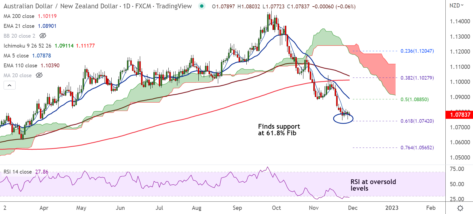 Summary: AUD/NZD has found strong support at 1.0795. Oversold oscillators might cause some pullback from lows. Major trend is bearish. Bearish invalidation only above 200-DMA.