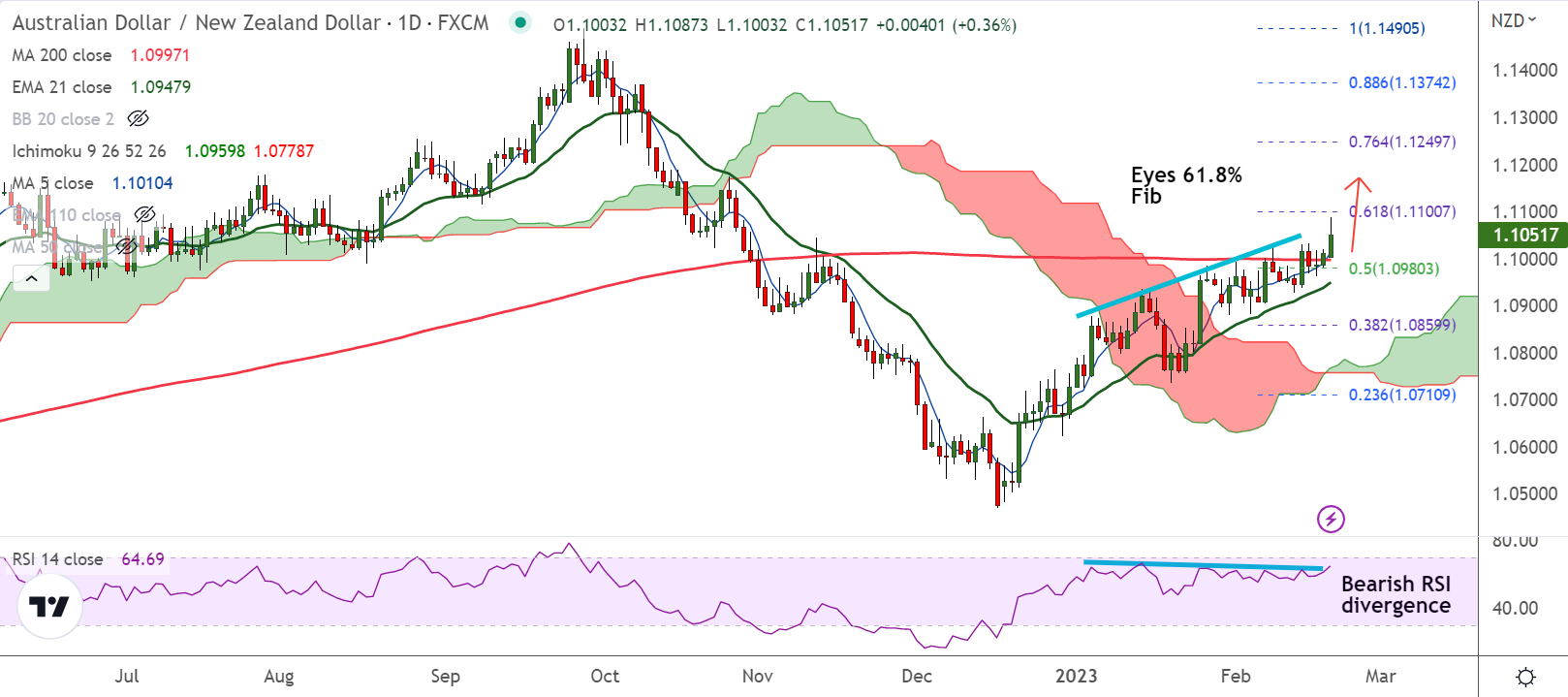 Summary: AUD/NZD trades with a bullish bias. The pair has shown a decisive break above 200-DMA, raising scope for further upside. 61.8% Fib in sight.