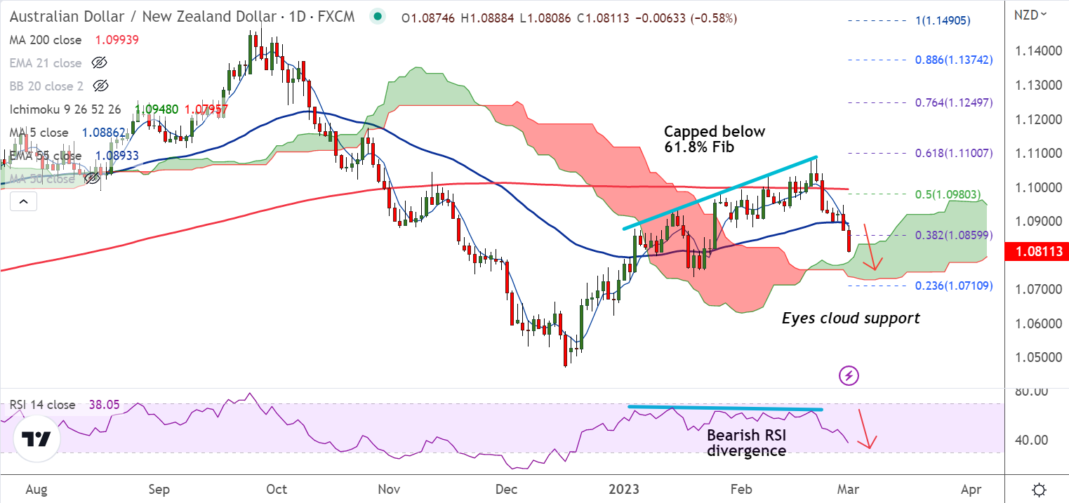 - Price action is extending weakness after rejection at 200-DMA, GMMA indicator shows minor trend is turning bearish