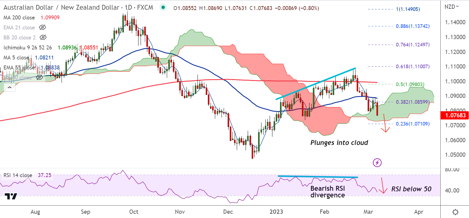 Summary: AUD/NZD trades with a bearish bias. Scope for break below daily cloud.