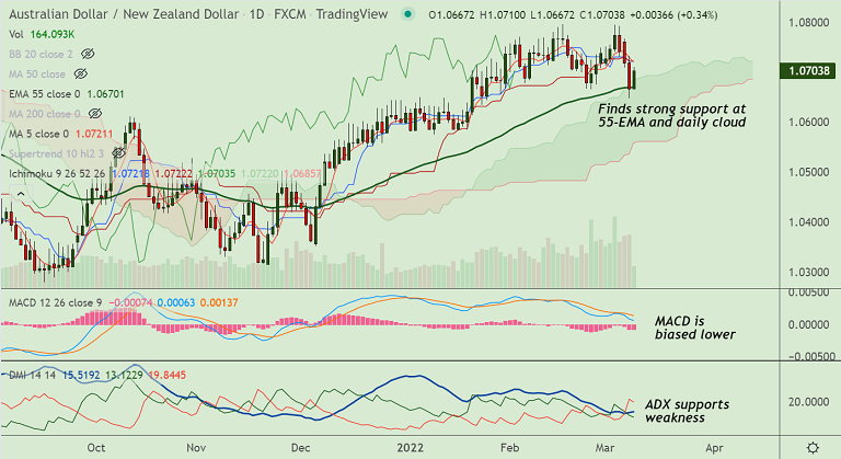 Summary: AUD/NZD halts downside at 55-EMA and daily cloud support. Weakness only on breach below. On the flipside, breakout above 200H MA will see upside resumption.