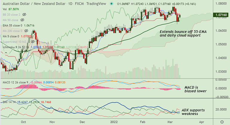 Summary: AUD/NZD halts downside at 55-EMA and daily cloud support. Weakness only on breach below. On the flipside, breakout above 200H MA will see upside resumption.