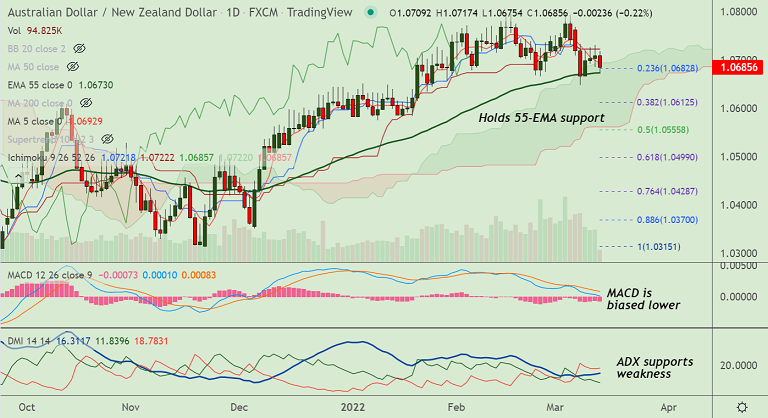 Summary: AUD/NZD pivotal at 55-EMA support. Watch out for break below for further weakness.