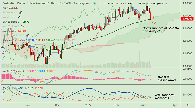 Summary: AUD/NZD trades with a bearish bias. Watchout for break below 55-EMA for further weakness.
