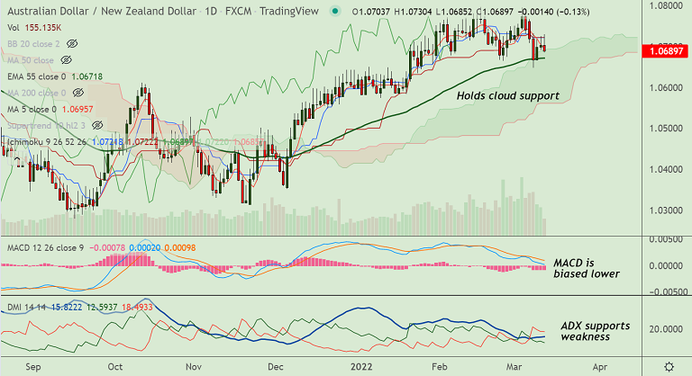 Summary: AUD/NZD trades with a bearish bias. Upside continuation only above 21-EMA.