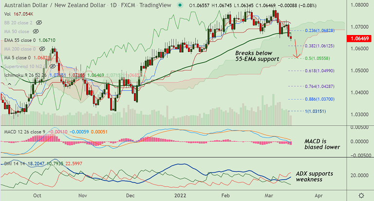 Summary: AUD/NZD trades with a bearish bias. Breach below 55-EMA has raised scope for further downside. Next bear target lies at 110-EMA at 1.0620.