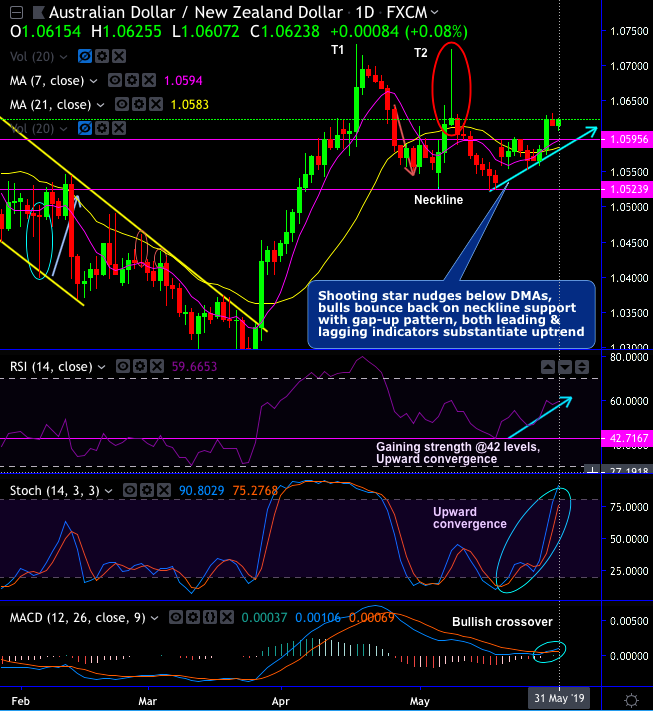 Chart and candlestick patterns formed: AUDNZD's minor trend takes support at the double top neckline (top 1 at 1.0729, top 2 at 1.0723 and neckline at 1.0523 levels, refer daily chart).