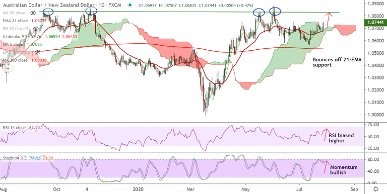 Technical bias has turned bullish after price action has bounced off 21-EMA support and daily cloud.