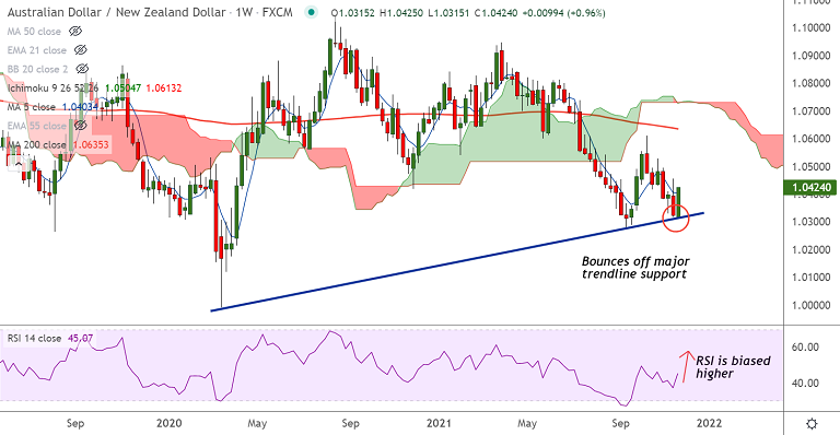 AUD/NZD was trading 0.44% higher on the day at 1.0421 after closing 0.50% higher in the previous session.