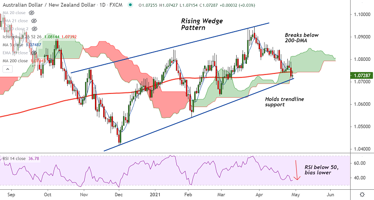 Summary: AUD/NZD trades with a bearish bias. Breach at 200-DMA support has raised scope for weakness. The pair is holding support at 1.0715 (Rising trendline), watch for break below for dip till 61.8% Fib at 1.0620.