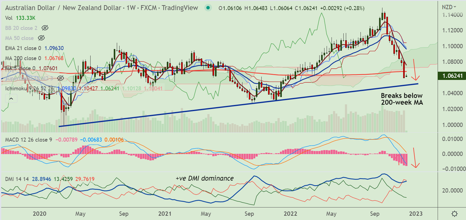 Summary: AUD/NZD trades with a bearish bias. Break below 200-week MA reinforces downside. Scope for test of trendline support at 1.0515.