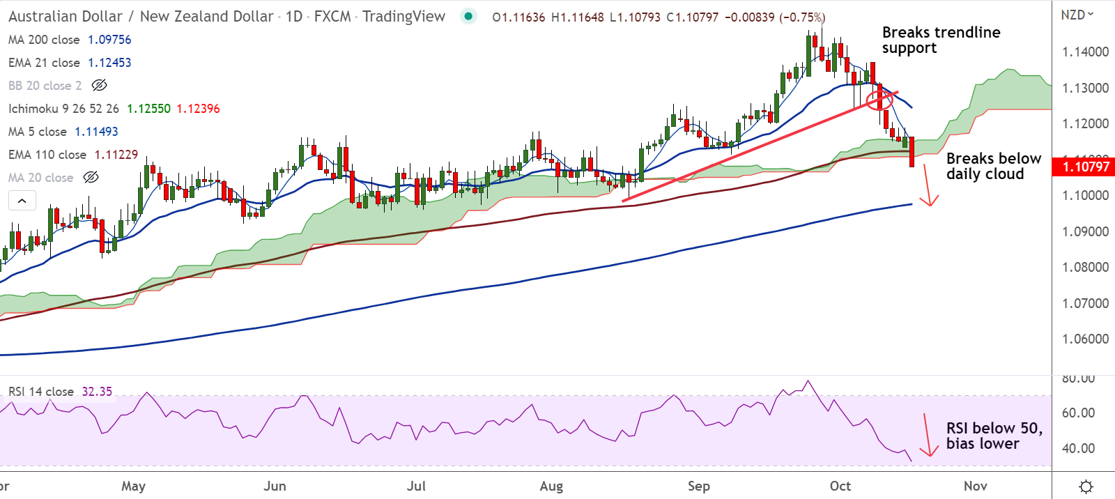 Summary: AUD/NZD trades with a bearish bias. Close below cloud will see more downside. Scope for test of 200-DMA support at 1.0975.