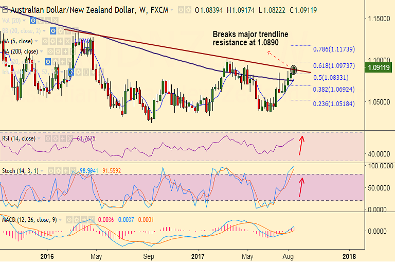 - AUD/NZD has broken major trendline resistance at 1.0890 on the weekly charts, bias still higher.