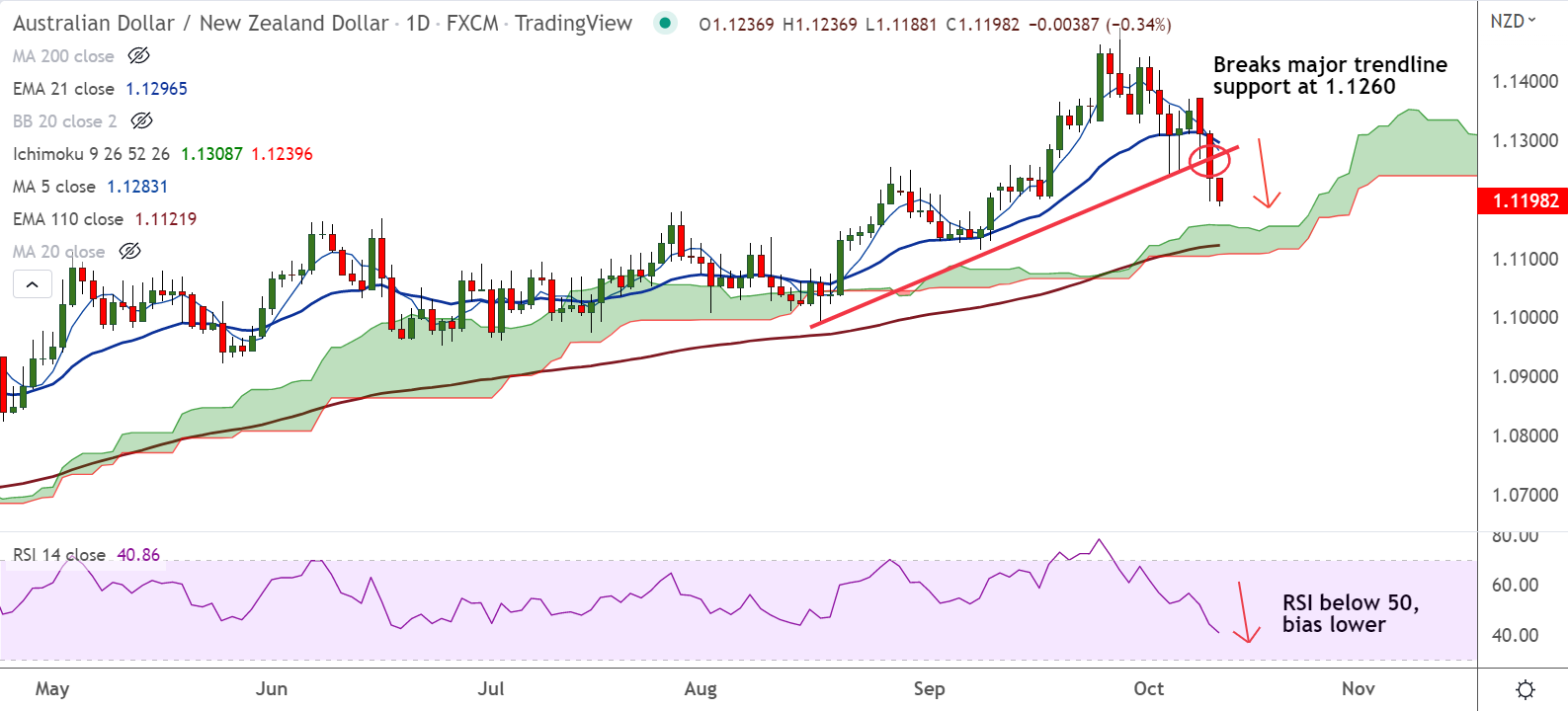 - Price action has broken major trendline support at 1.1260, is on track to test daily cloud support.