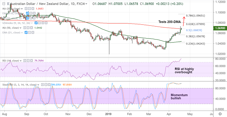 - AUD/NZD bulls test 200-DMA resistance at 1.0684, hits 5-month high at 1.0729.
