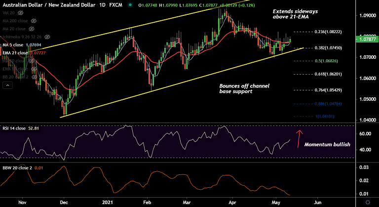 The pair is extending consolidation above 21-EMA support and technical analysis suggests the pair is poised for upside resumption.