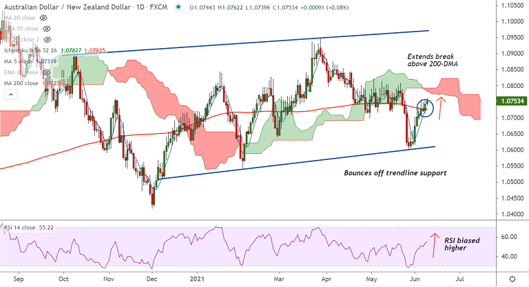 Summary: AUD/NZD has shown a decisive break above 200-DMA, raising scope for further upside. Bulls target daily cloud. Breakout above cloud will propel the pair higher. Weakness only on retrace below 200-DMA.