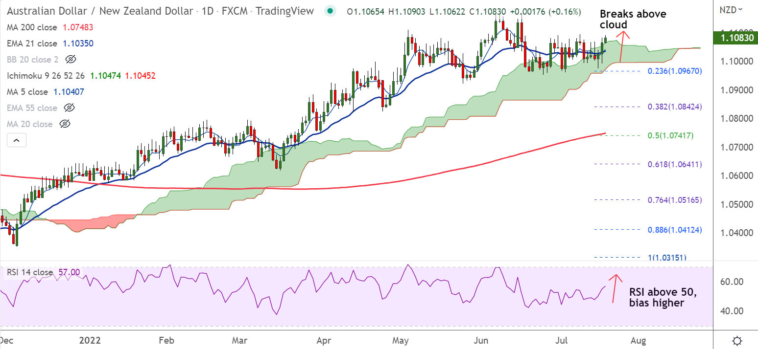 Summary: AUD/NZD poised for further upside. Weakness only below daily cloud.