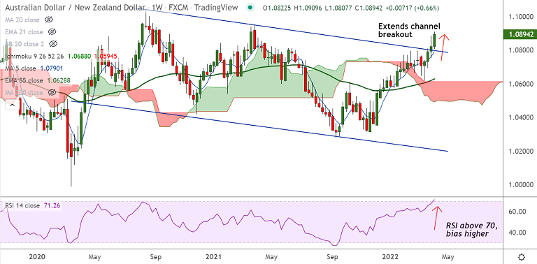 AUD/NZD was trading 0.38% higher on the day at 1.0895 at around 10:55 GMT, outlook strongly bullish.