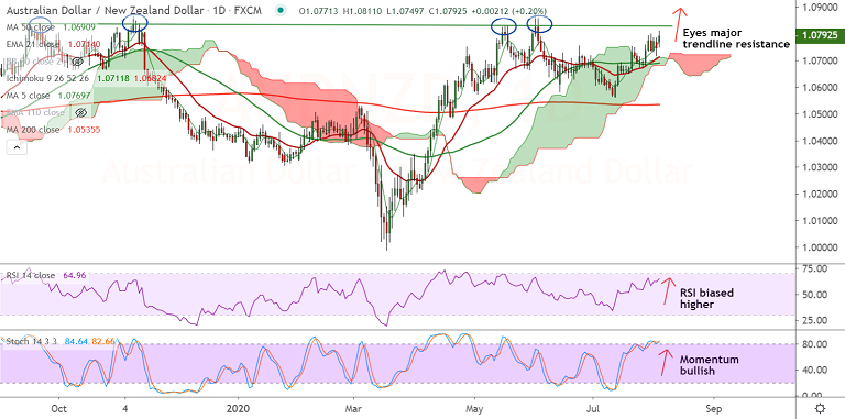 AUD/NZD is extending grind higher, extends gains along rising 5-DMA.