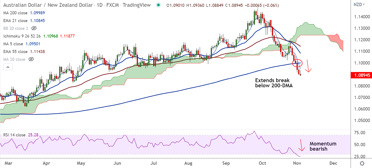 Summary: AUD/NZD trades with a bearish bias. Break below 200-DMA has raised scope for further downside. Dip till 110-week EMA at 1.0822 likely.