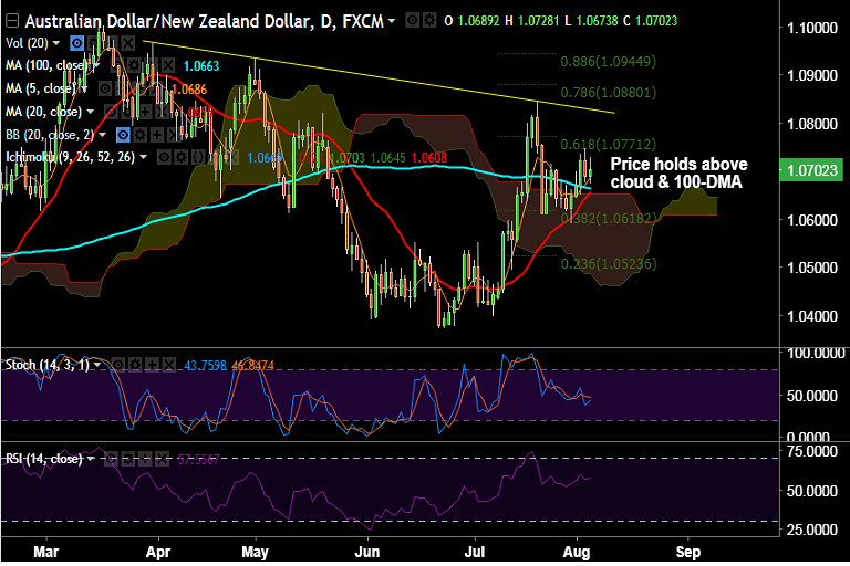 - AUD/NZD halted downside, bounced off 20-DMA. Price is holding break above 100-DMA and daily cloud.