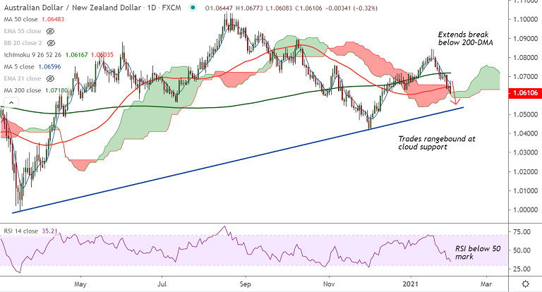 The pair is extending weakness below 200-DMA and is hovering at daily cloud support. Technical indicators are biased lower, scope for further downside in the pair.