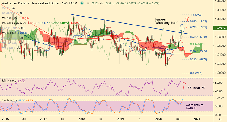 The pair has ignored a 'Shooting Star' formation on the weekly charts and has resumed upside.