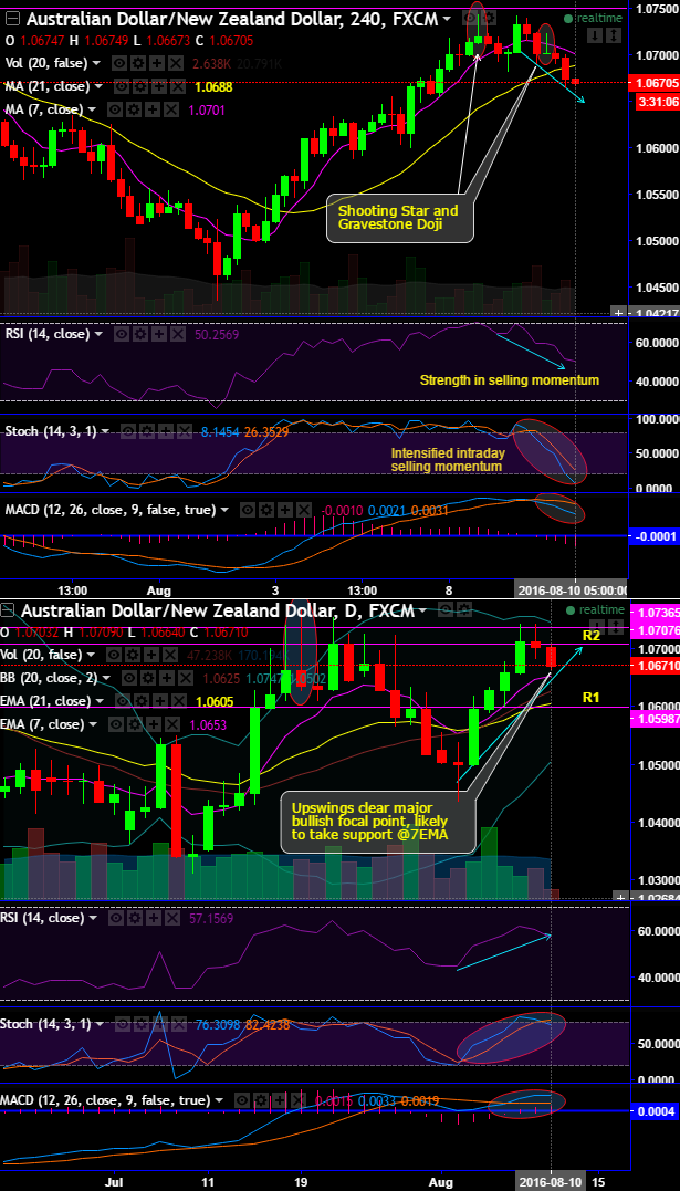 However, prior to these bearish evidences, in the recent past Aussie dollar against Kiwi dollar has recovered its price losses, bulls started pushing hard vigorously from the lows of 1.0436 to the highs of 1.0743 levels (almost about 2.94%).