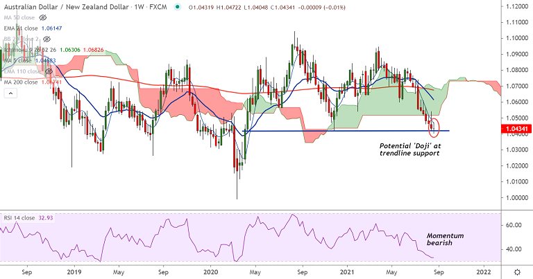 - AUD/NZD is on track to close the week with a Doji formation at major trendline support, bearish bias remains intact