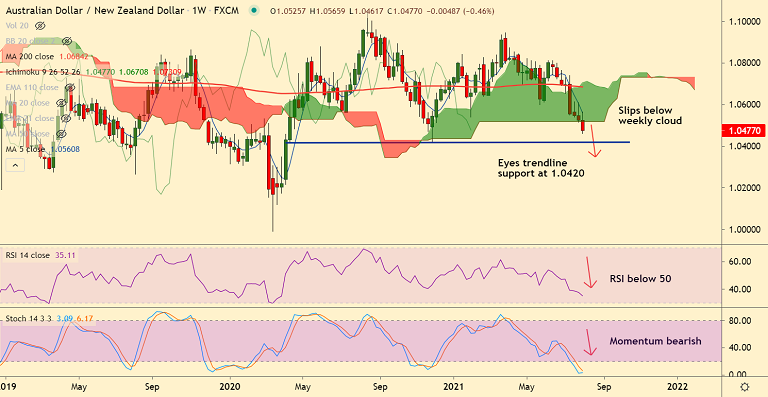 Summary: AUD/NZD trades with a bearish bias on the hourly, daily and weekly time frames. Oversold oscillators warrant caution.